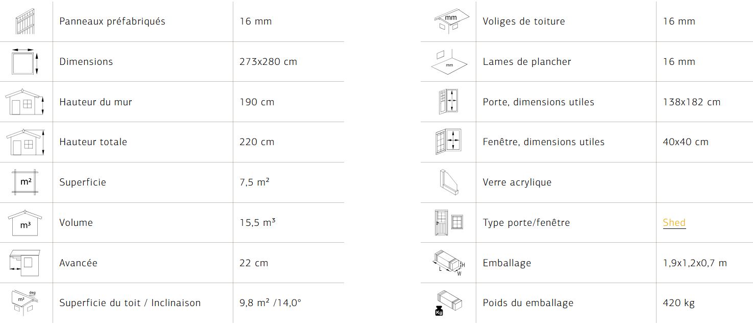 Abris de jardin en panneaux préfabriqués de 16mm DAN 7.5 m² est pratique pour entreposer du mobilier extérieur ou le stockage du matériel de jardin. Plancher et lambris de 16 mm.