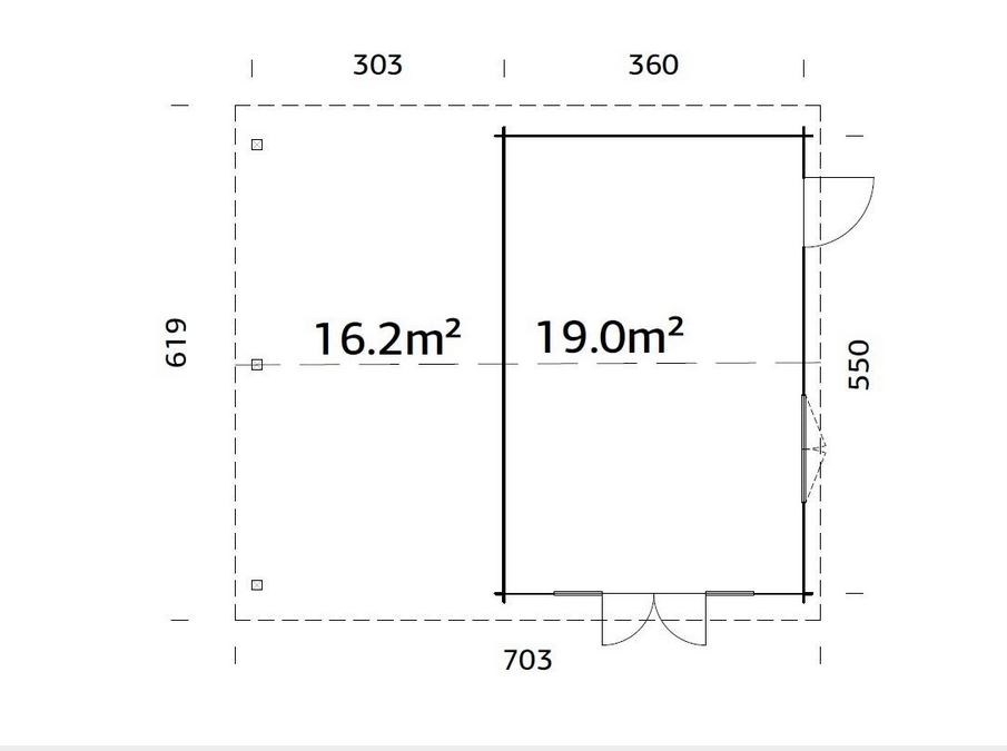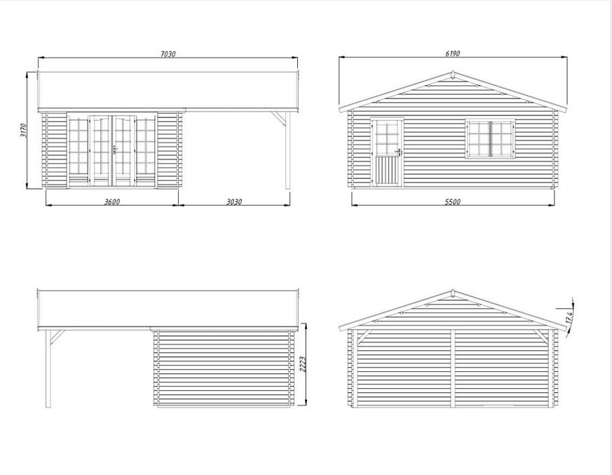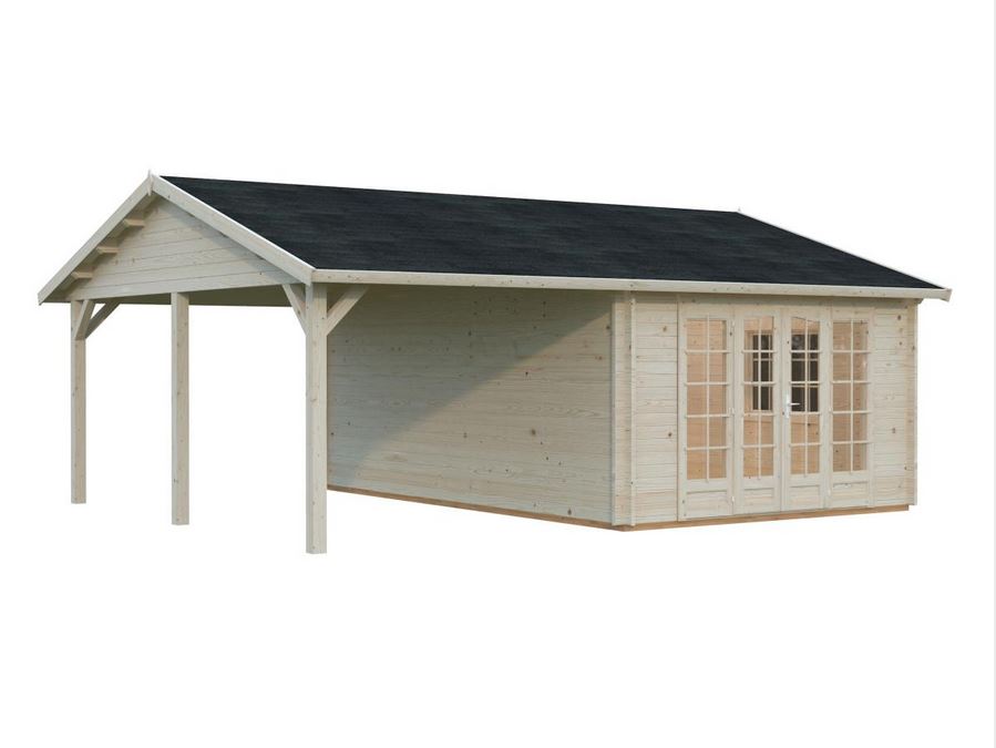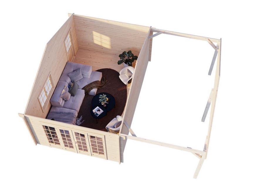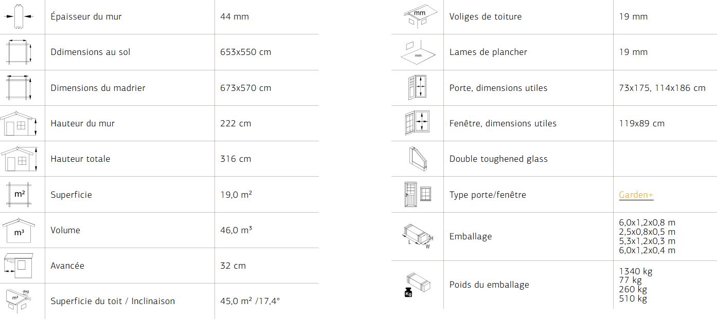 Construction en madriers de 44 mm double feuillure avec des pannes en bois lamellé collé, vous assure une durabilité dans le temps. 2 dimensions sont disponible sur ce modèle. Les menuiseries sont en double vitrage trempé 4/6/4 mm : une porte double, une fenêtre 2 vantaux, une porte de service. Toutes ses caractéristiques assure un confort pour un espace de vie agréable. Plancher et lambris de toiture 19 mm.