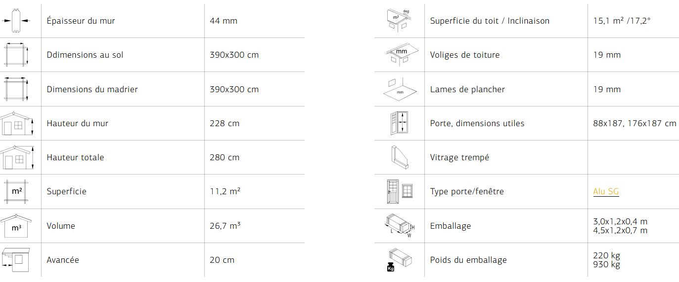 Abris en épicéa nordique toit plat en madriers de 44 mm . Deux baies coulissantes en double vitrage trempé 4 mm. Plancher et lambris 19 mm inclus