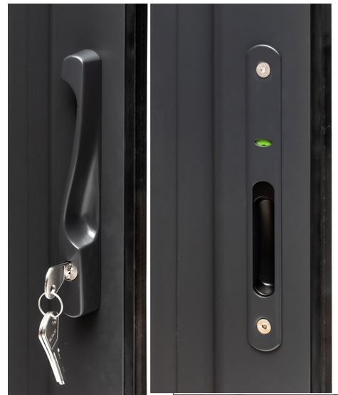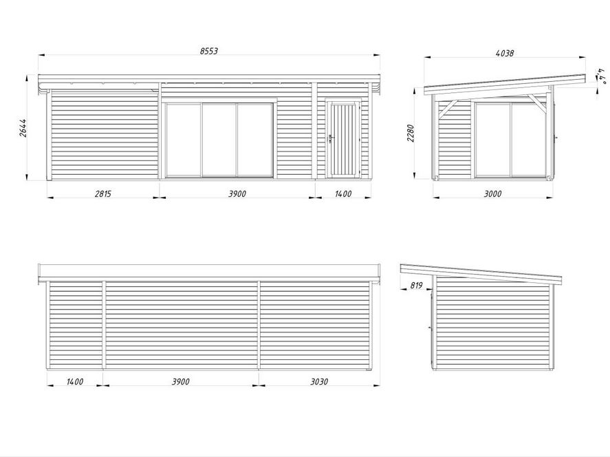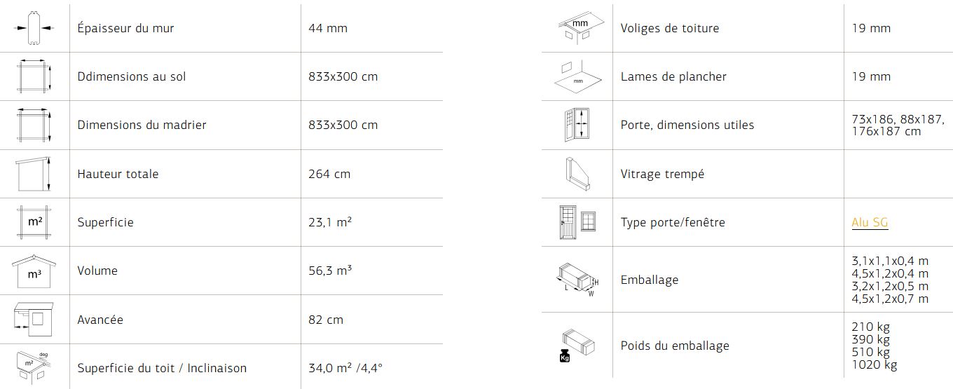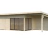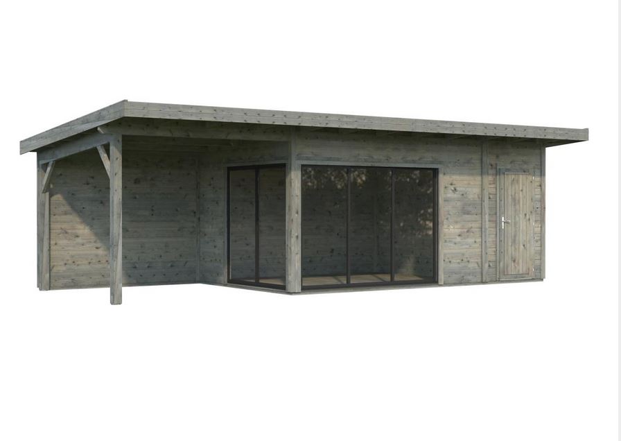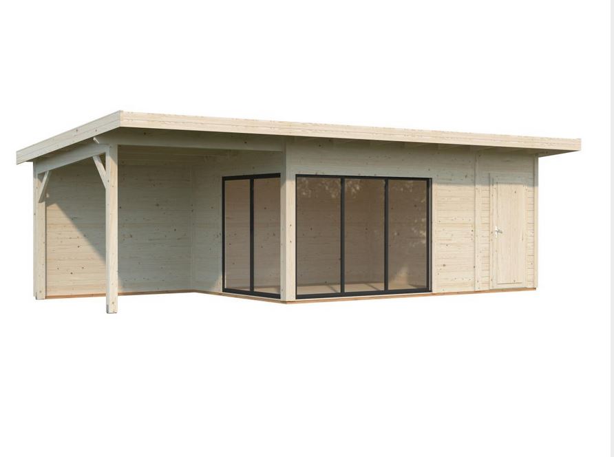 Abris en épicéa nordique toit plat en madriers de 44 mm . Deux baies coulissantes en double vitrage trempé 4 mm. Plancher 19 mm inclus