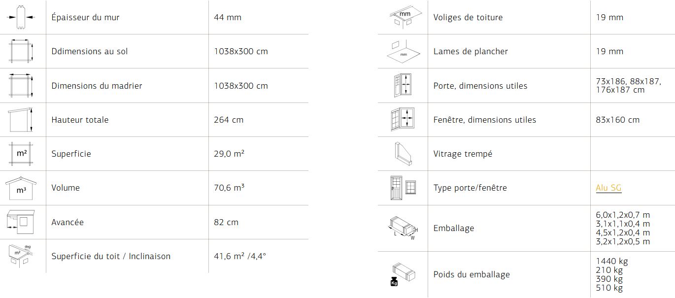 Abris en épicéa nordique toit plat en madriers de 44 mm . Deux baies coulissantes en simple ou double vitrage trempé 4 mm. Plancher 19 mm inclus
