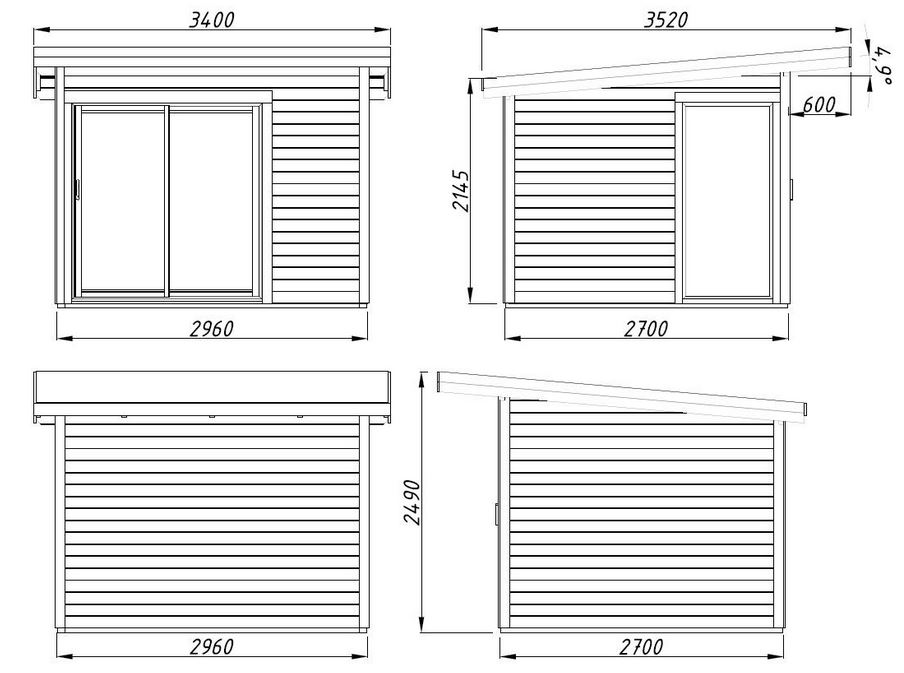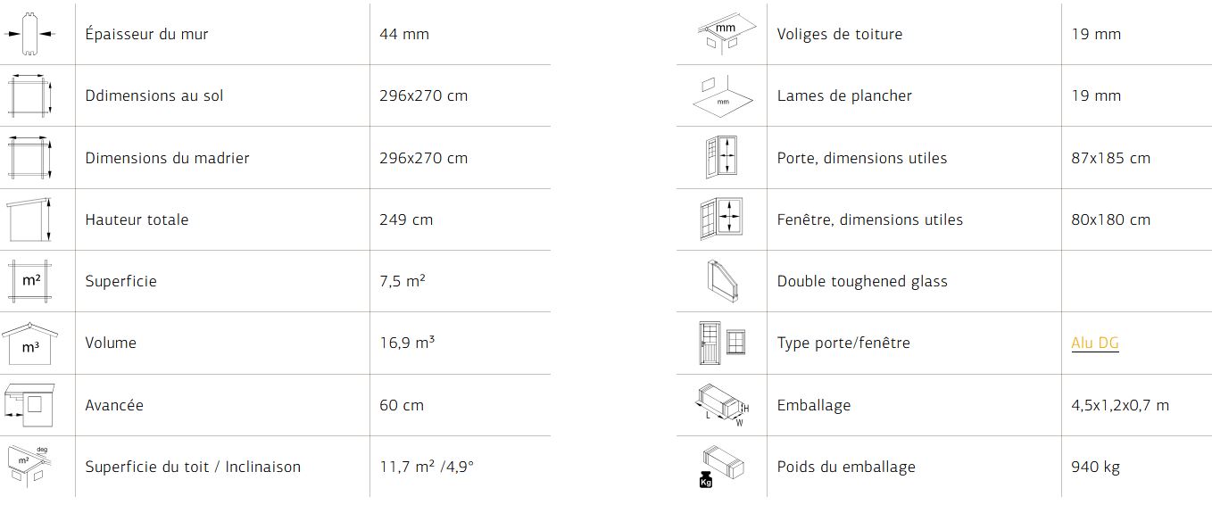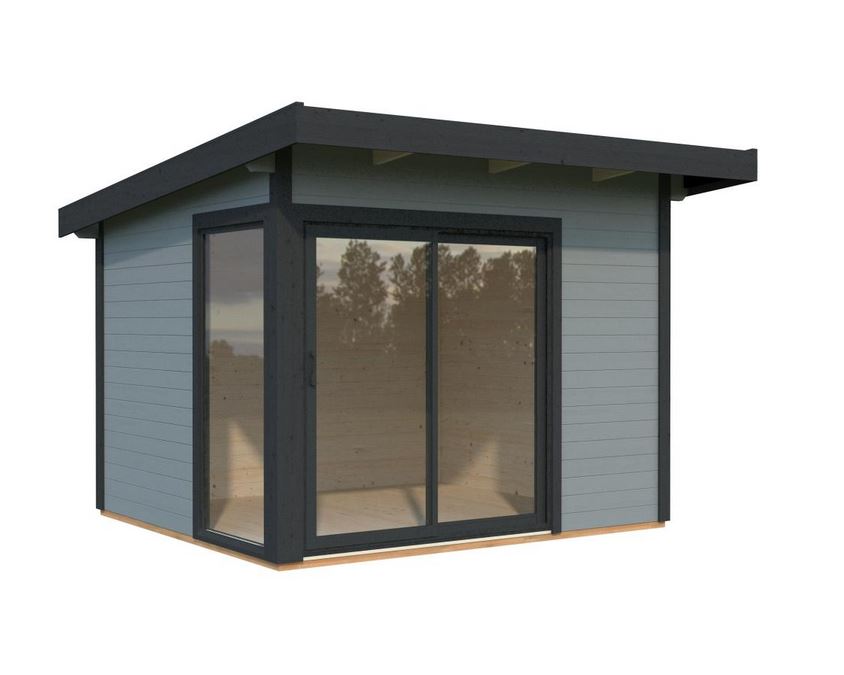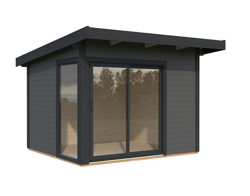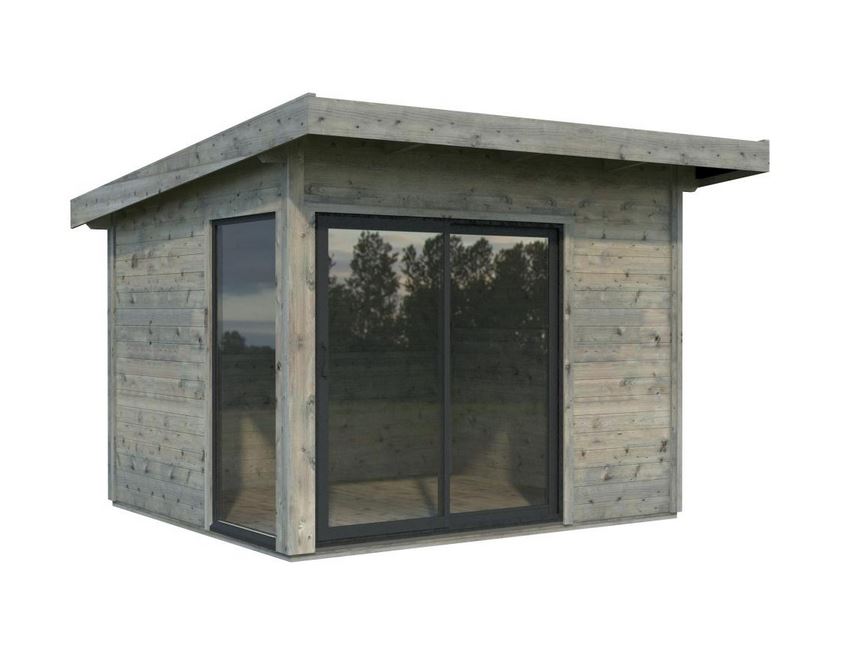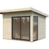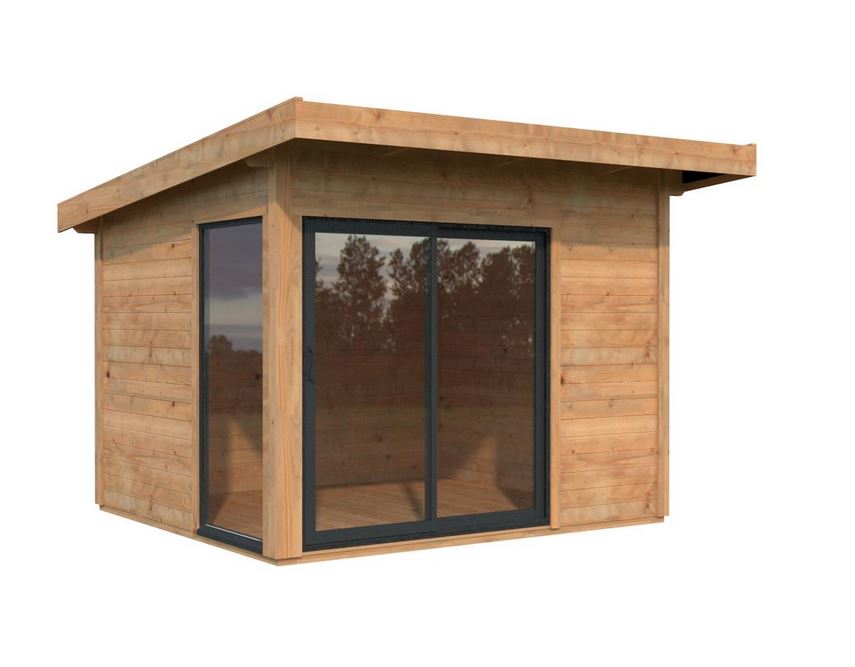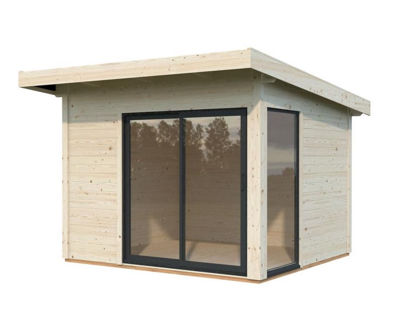 Abris en épicéa nordique toit plat en madriers de 44 mm . Deux baies coulissantes en double vitrage trempé 4 mm. Plancher 19 mm inclus