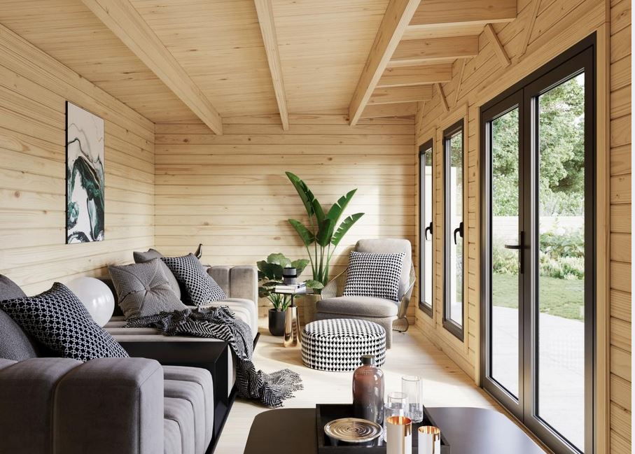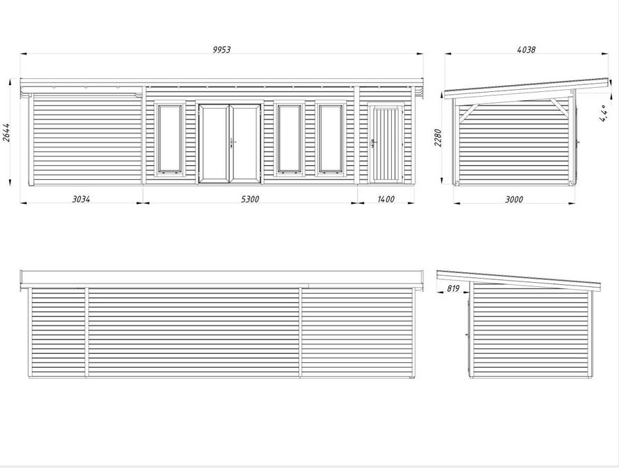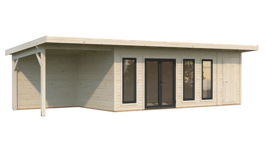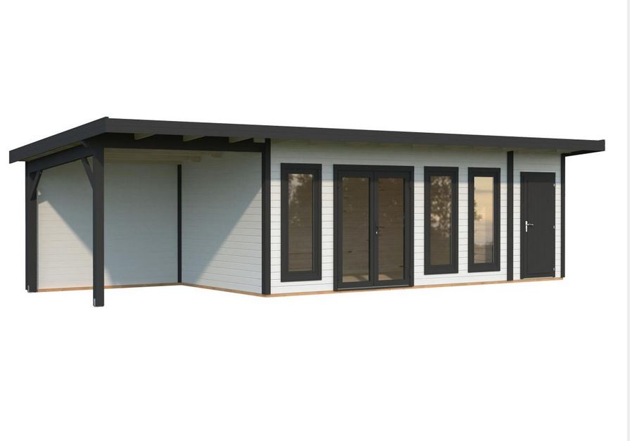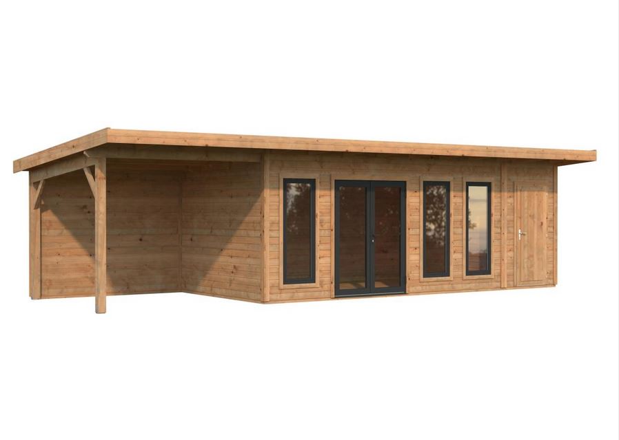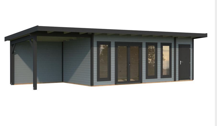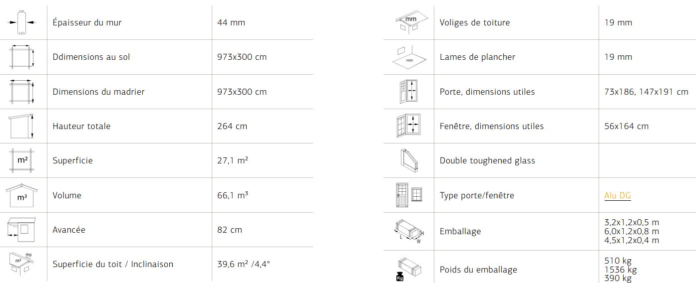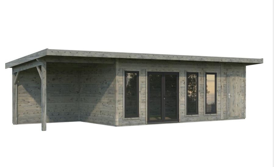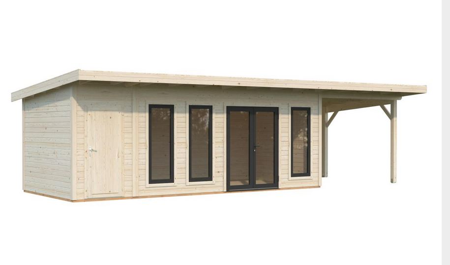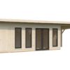 Abris en épicéa nordique toit plat en madriers de 44 mm . Deux baies coulissantes en double vitrage trempé 4 mm. Plancher 19 mm inclus