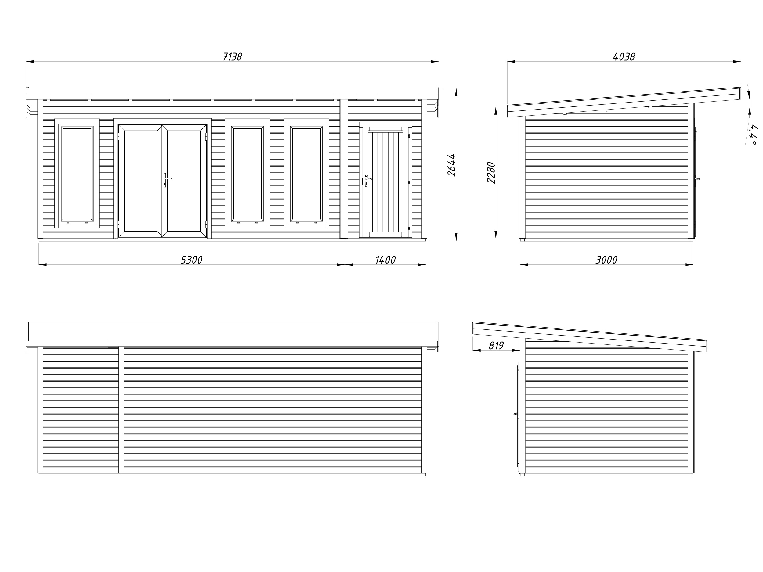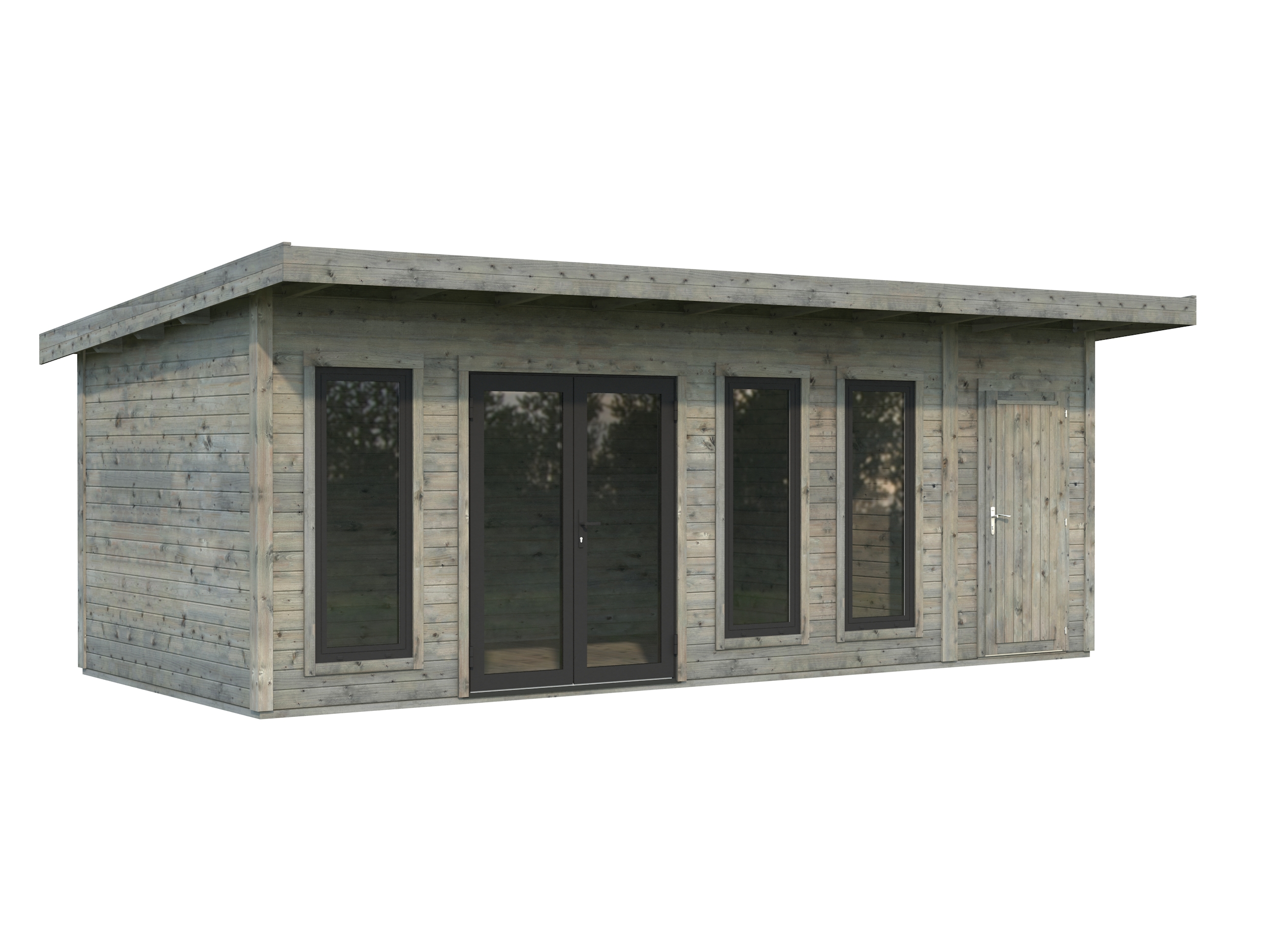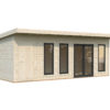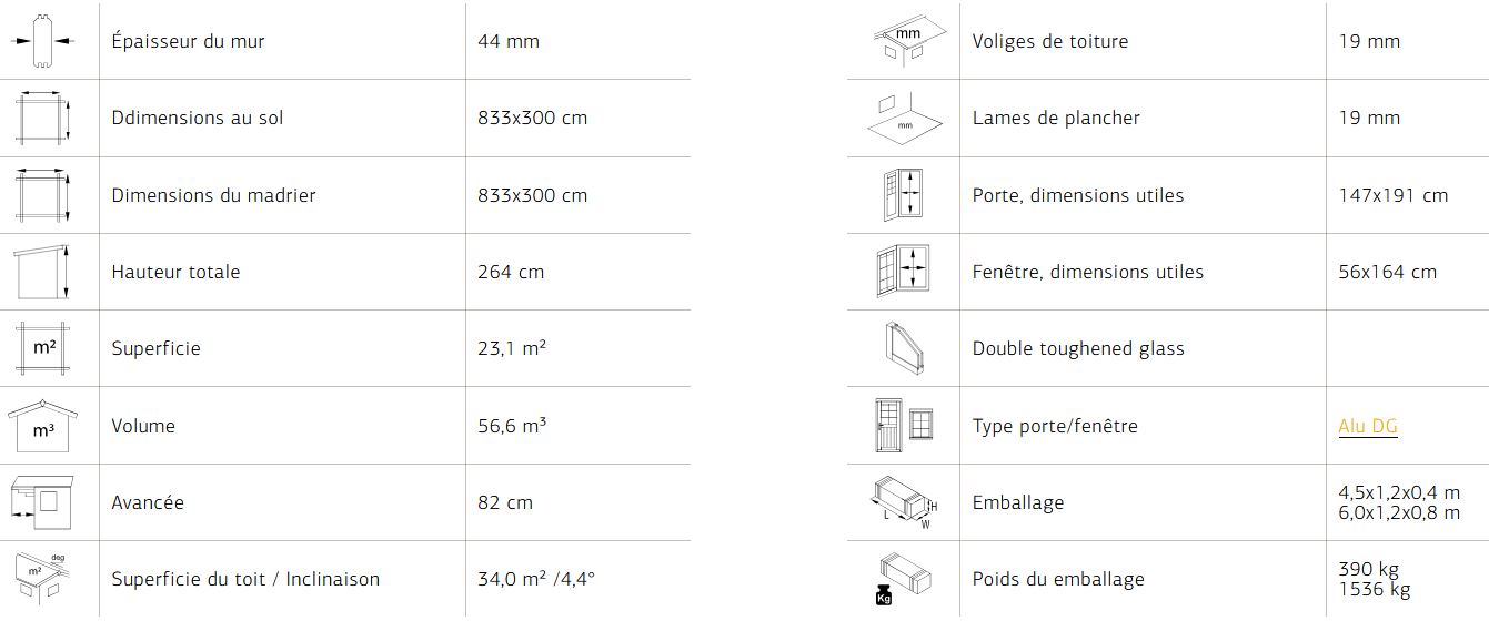 Abris en épicéa nordique toit plat en madriers de 44 mm . Deux baies coulissantes en double vitrage trempé 4 mm. Plancher 19 mm inclus