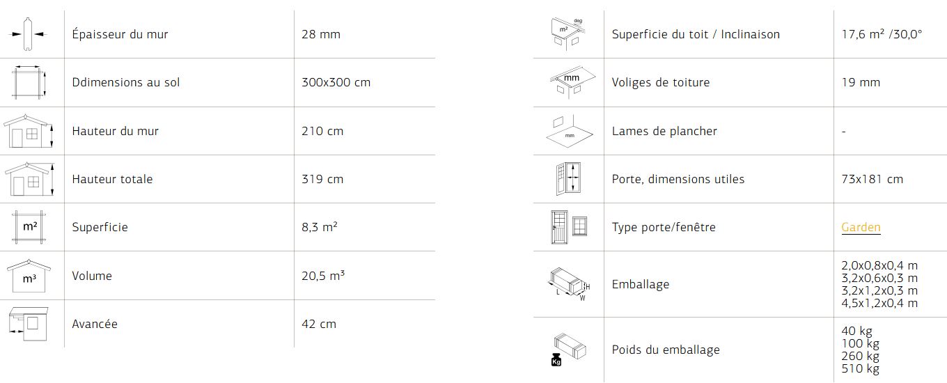Options : couverture Shingle rouge ou noir (inclus 9 paquets de 3m²). Traitement usine Brun ou Gris vintage.