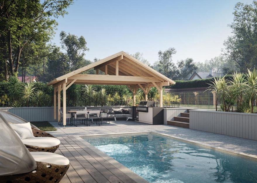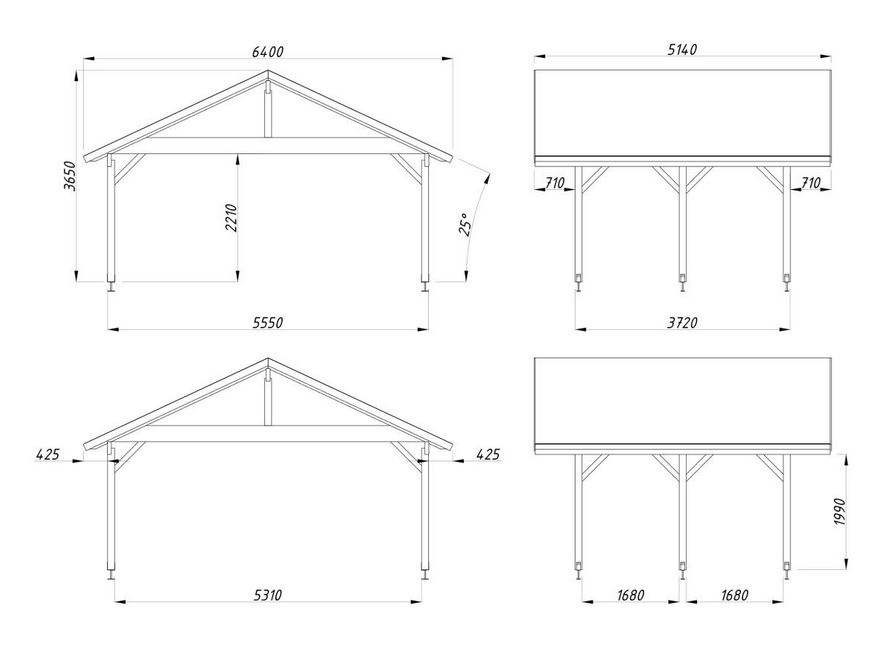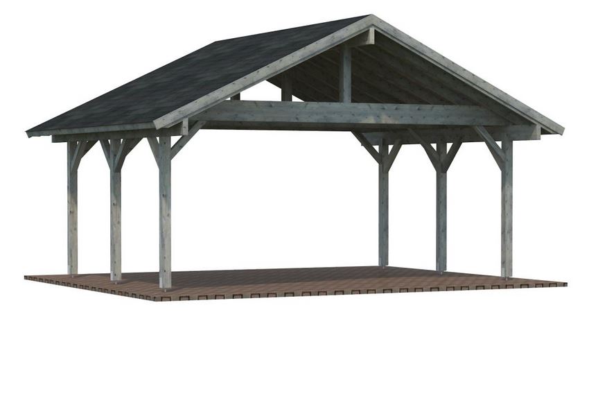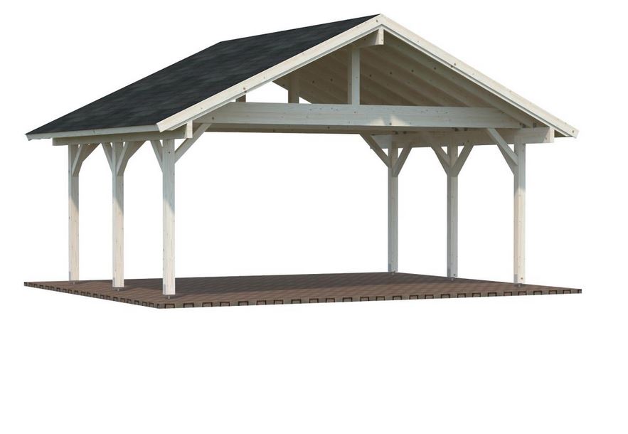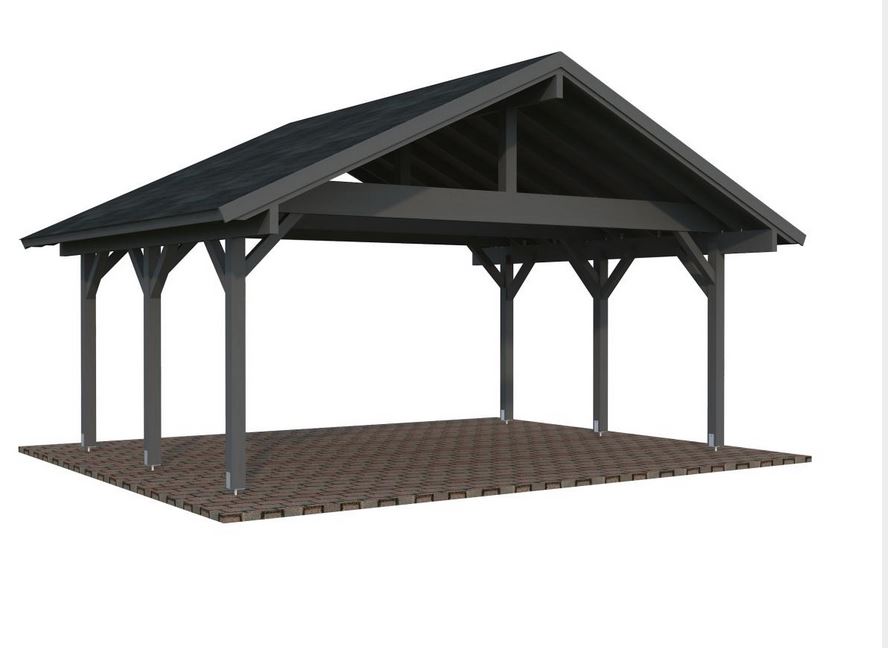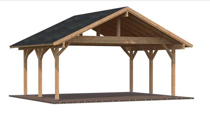 Auvent toiture 2 pentes d’une construction très robuste, qui se compose de pannes, de liens, et de 6 poteaux lamellé collé de 12 x 12 cm d’une hauteur de passage de 2.21 m, hauteur de faîtage de 3.63 m. Lambris sous toiture 19 mm. Vendu sans ancrages prévoir 6 pièces.