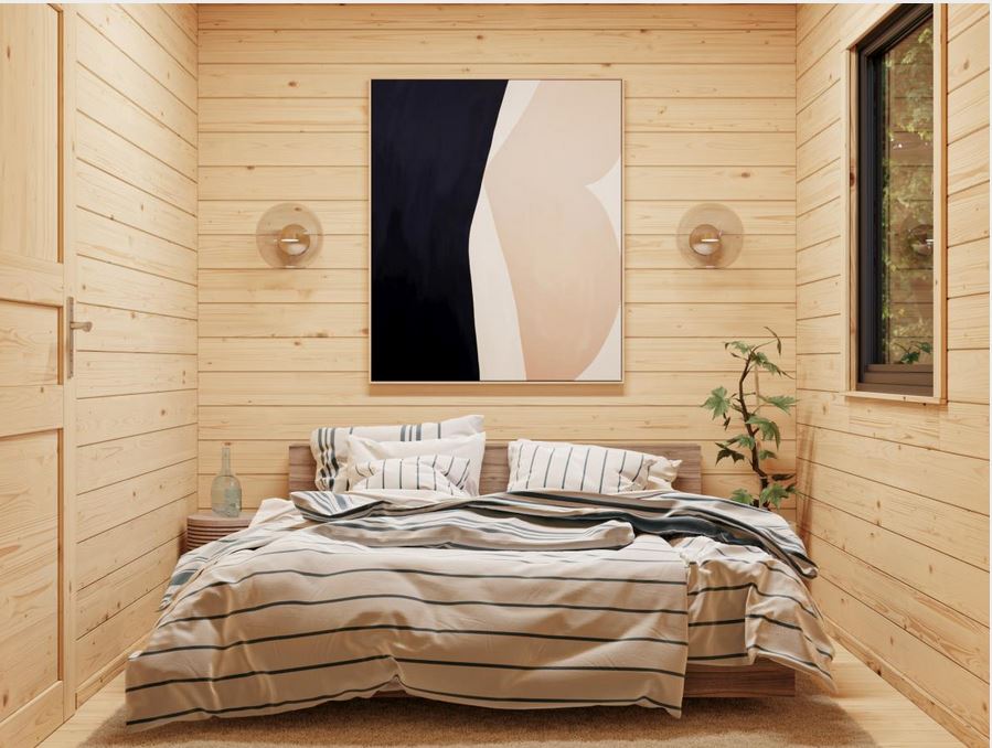 Chalet de jardin idéal pour l’aménagement d’un studio, il a la particularité d’être lumineux avec ses baies en double vitrage trempé . Réalisé en madriers de 70 mm double emboîtement avec tiges filetées,  il vous garantira une solidité et une aisance de construction. Plancher 28 mm et lambris sous toiture 19 mm. Ce modèle est disponible en 7 dimensions.