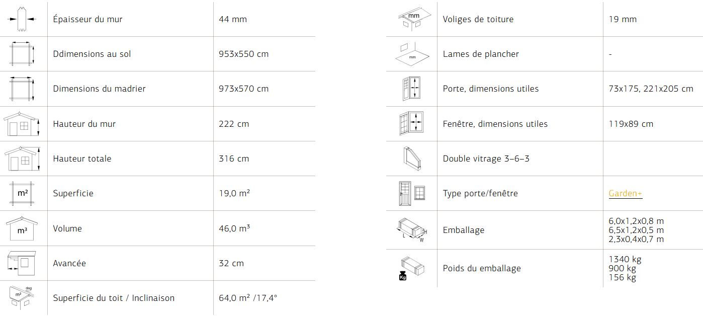 Options : Couverture toit shingles noir, rouge, (inclus 24 paquets de 3 m²) Traitement usine Brun ou Gris vintage. Peinture en usine gris, anthracite, blanc (voir photos)