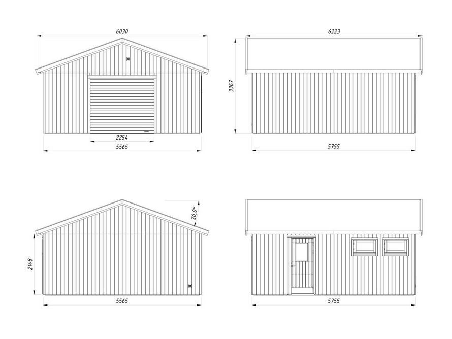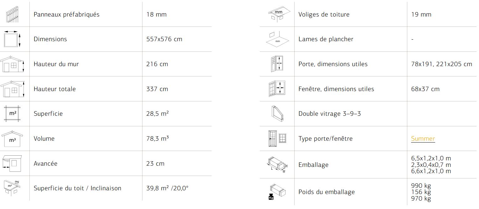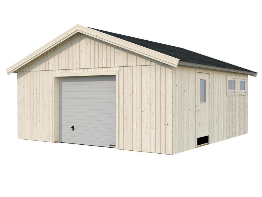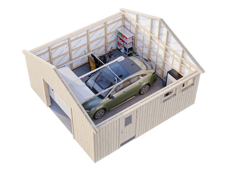 Garage conçu en panneaux de 160 mm préfabriqués, son bardage vertical légèrement nervuré lui donne un aspect original et novateur. Vous avez la possibilité d’isolé votre garage. Ces menuiseries comprennent : une porte sectionnelle pouvant être motorisée; une porte de service de 78 x 181 cm ; deux fenêtres de 69 x 38 cm ouvrant vers l’extérieur. Lames sous toiture de 19 mm. Tous les modèles ont un double vitrage thermique 3/9/3 mm.