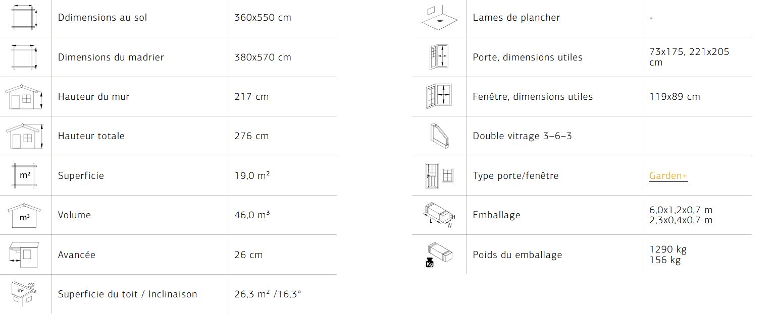 Garage réalisé en madriers de 44 mm à double emboîtement pour une meilleure résistance. Les menuiseries sont en bois massif contrecollé dont une porte de service demi vitrée et une fenêtre deux vantaux double vitrage 3/6/3 mm. Porte sectionnelle 221 x 188 en panneaux acier (épaisseur 40 mm) sont remplis avec la mousse polyuréthane sans fréon. (teinté blanc). Volige de toiture en bois massif 19 mm. Pannes de toit lamellé collé de 60 x 240 mm.