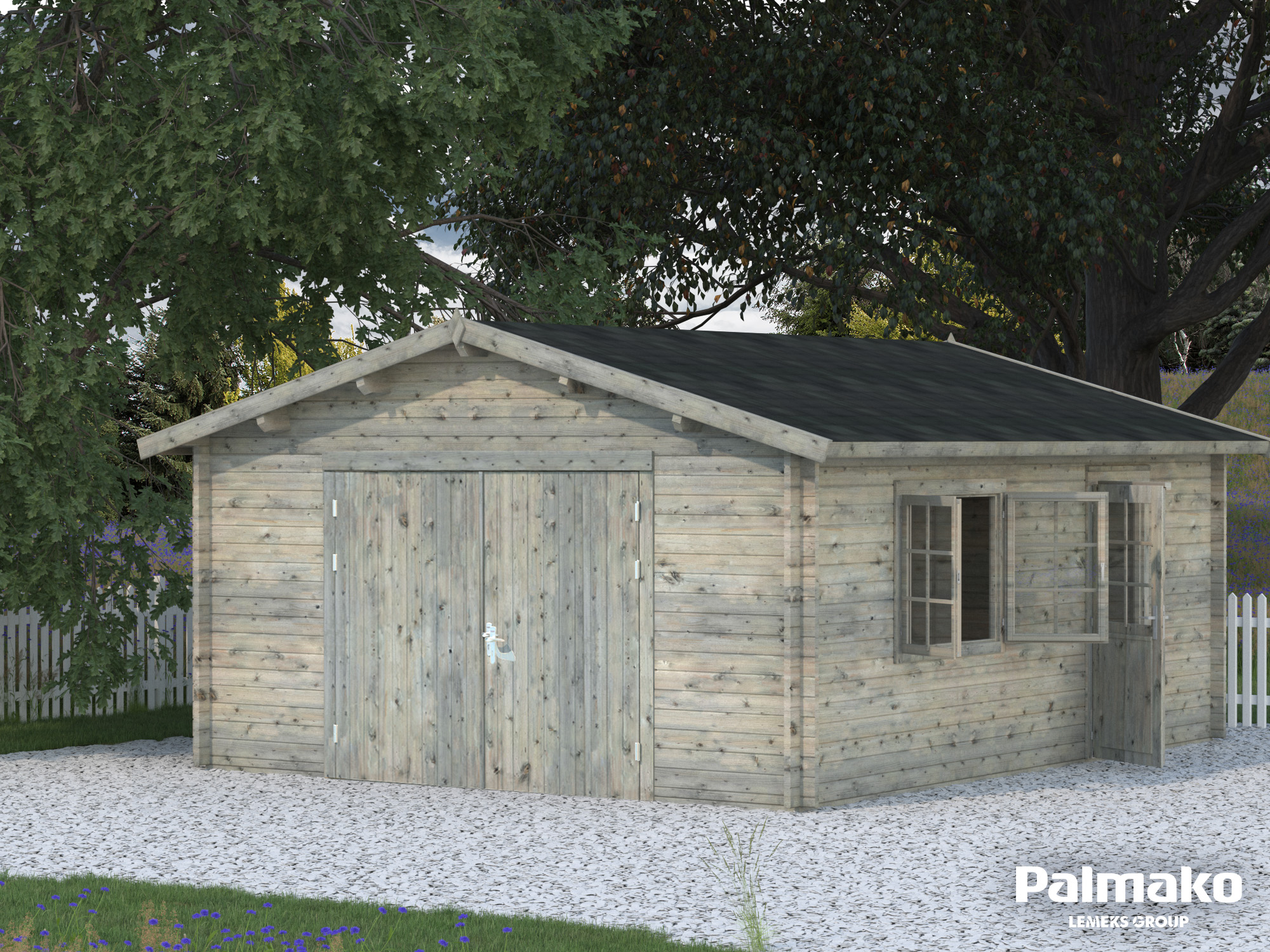 Garage en bois du nord en madriers de 44 mm à double emboîtement. Menuiseries en bois massif contre collé comprenant : 1 porte de service, 1 fenêtre 2 vantaux double vitrage 3/6/3 mm. Volige de toiture en bois massif 19 mm avec feutre inclus. Pannes de toit lamellé collé de 60 x 200 mm.