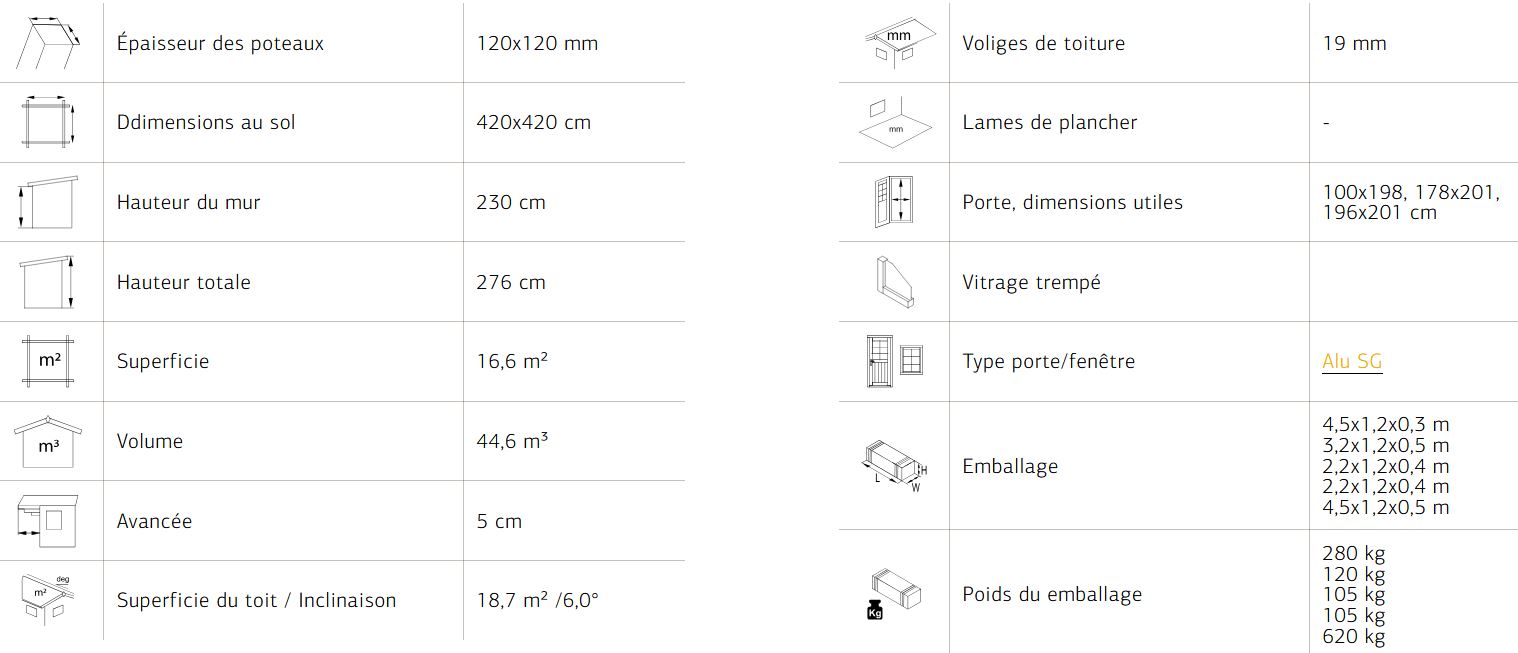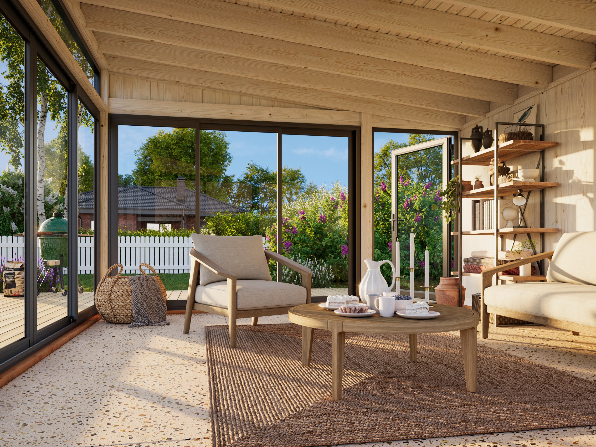 Jardin d’hiver sur poteaux robustes en épicéa nordique lamellé collé de 120 x 120 mm. Menuiseries baies coulissantes en alu vitrage trempé. En Option :  traitement ou peinture en usine (voir photos) et couverture de toit.