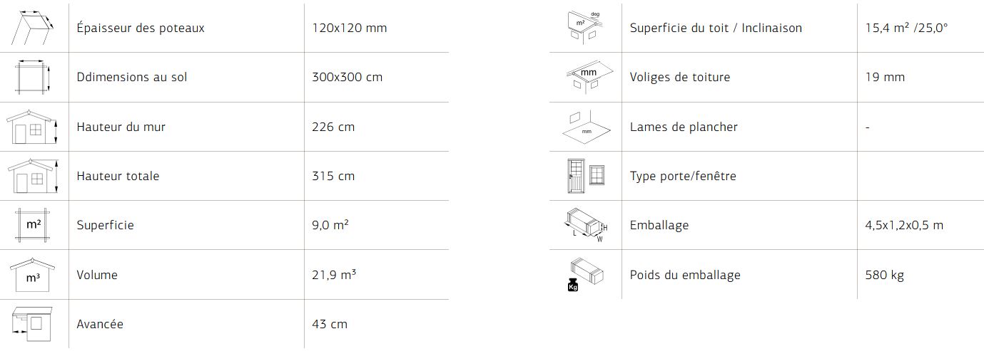 Options : couverture shingles noir, rouge, (inclus 8 paquets de 3 m²) traitement usine Brun ou Gris ou peinture en usine blanc.